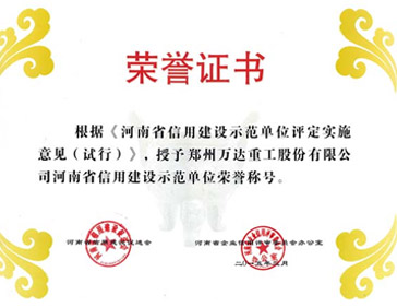 2016/01/28 558 熱烈祝賀鄭州萬達(dá)重工股份有限公司通過了河南省信用建設(shè)促進(jìn)會和河南省企業(yè)信用評審委員會辦公室共同組織的河南省信用建設(shè)示范單位復(fù)審認(rèn)證,被認(rèn)定為河南省信用建設(shè)示范單位榮譽(yù)稱號!