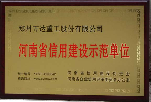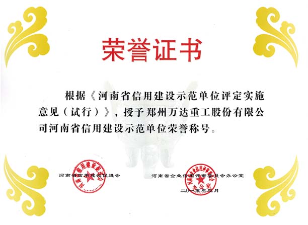 熱烈祝賀鄭州萬(wàn)達(dá)重工股份有限公司通過(guò)了“河南省信用建設(shè)促進(jìn)會(huì)”和“河南省企業(yè)信用評(píng)審委員會(huì)辦公室”共同組織的“河南省信用建設(shè)示范單位”復(fù)審認(rèn)證,被認(rèn)定為“河南省信用建設(shè)示范單位”榮譽(yù)稱號(hào)!