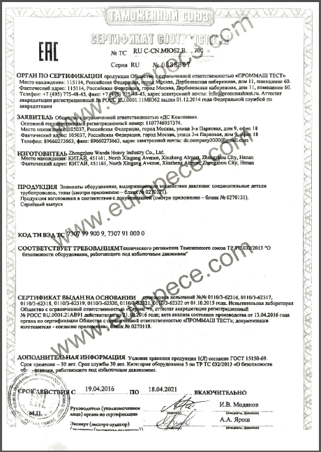 2016年4月20日,鄭州萬達重工股份有限公司順利通過海關(guān)聯(lián)盟“CU-TR”認證,并獲得由“SERCONS”機構(gòu)頒發(fā)的證書。