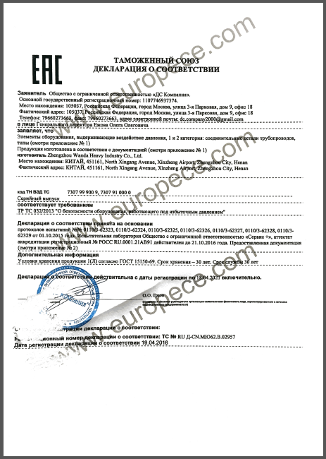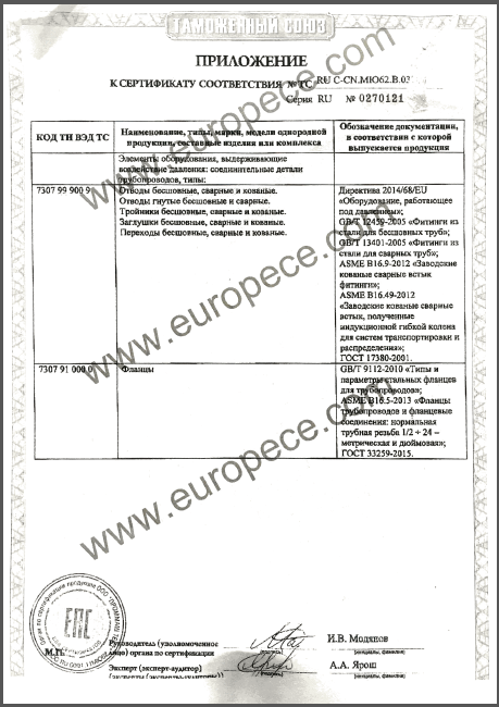 CU-TR認證產(chǎn)品覆蓋萬達重工生產(chǎn)的彎管、法蘭等各類型產(chǎn)品,認證證書的取得是俄白哈對萬達重工產(chǎn)品資料、安全標識、產(chǎn)品性能的肯定,同時驗證了萬達重工的產(chǎn)品質(zhì)量又邁上了一個更高的臺階。近年來,我公司積極開拓海外市場,把擴大國際市場作為重要的發(fā)展戰(zhàn)略,此次CU-TR認證證書的取得,為我司進一步開拓歐洲市場提供了強有力的保證。