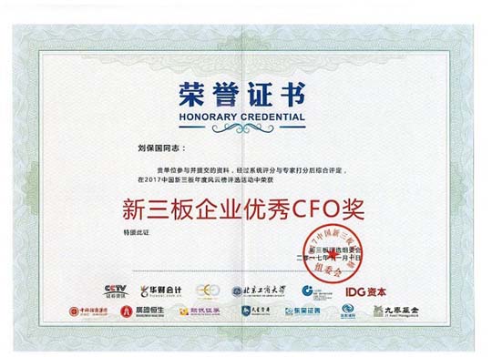 本次活動依據(jù)華財(cái)新三板投資者保護(hù)指數(shù)、財(cái)務(wù)指標(biāo)等作為基本入圍條件,加上專家打分和網(wǎng)絡(luò)投票,歷經(jīng)3個(gè)多月最終確定獲獎名單。鄭州萬達(dá)重工股份有限公司憑借著深厚的文化底蘊(yùn),先進(jìn)的管理理念、精準(zhǔn)的財(cái)務(wù)數(shù)據(jù)等綜合實(shí)力榮獲“2017年中國新三板年度風(fēng)云榜”最佳公司治理獎;公司財(cái)務(wù)總監(jiān)劉保國先生憑借著專業(yè)的技術(shù)能力,優(yōu)秀的個(gè)人素養(yǎng)榮獲“2017年中國新三板”企業(yè)優(yōu)秀CFO獎。
