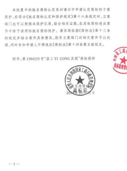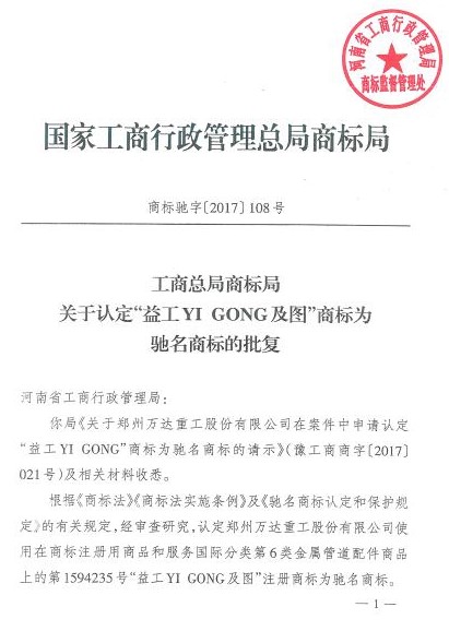 根據(jù)國家工商行政管理總局商標(biāo)局下發(fā)的商標(biāo)馳字【2017】108號《工商總局商標(biāo)局關(guān)于認(rèn)定“益工 YI GONG及圖”商標(biāo)為馳名商標(biāo)的批復(fù)》文件,公司使用在商標(biāo)注冊用商品和服務(wù)國際分類第6類金屬管道配件商品上的“第1594235號益工YI GONG及圖”商品被認(rèn)定為中國馳名商標(biāo)”,這不僅是公司商標(biāo)保護(hù)的重大成果,也實現(xiàn)了鄭州航空港經(jīng)濟(jì)綜合實驗區(qū)馳名商標(biāo)零的突破。