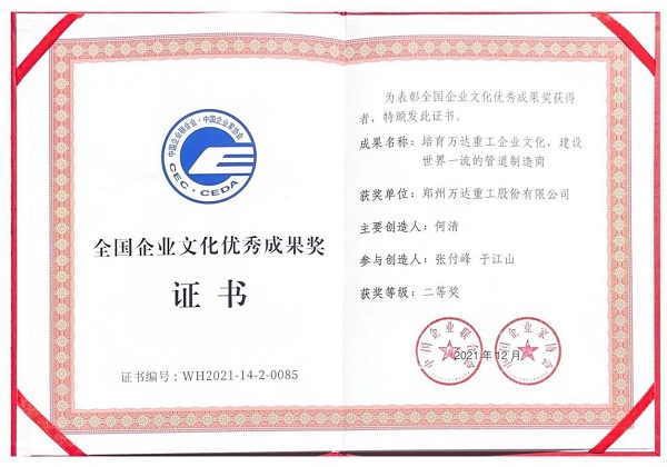 鄭州萬達(dá)重工股份有限公司以系統(tǒng)完善的企業(yè)文化體系及卓有成效的企業(yè)文化實(shí)踐,榮獲“2020-2021年度全國企業(yè)文化優(yōu)秀成果二等獎(jiǎng)”!
