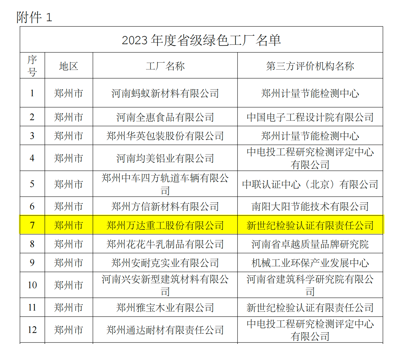 經(jīng)信息化主管部門推薦、專家評審及公示等程序,2023年6月16日河南省工信廳發(fā)布了《2023年度省級綠色制造名單》,名單公布確定了2023年度河南省綠色工廠109家、綠色工業(yè)園區(qū)9個、綠色供應鏈管理企業(yè)22家、綠色設計產(chǎn)品型號25個,鄭州萬達重工股份有限公司被認定為“2023年度省級綠色工廠 ”。