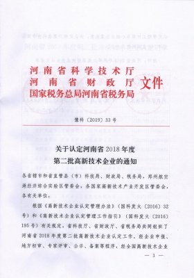 喜訊:鄭州萬達(dá)重工股份有限公司被認(rèn)定為河南2018年度高新技術(shù)企業(yè)