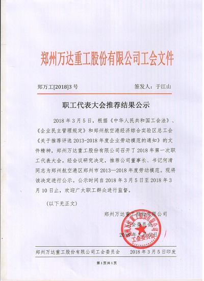 2018/03/08 3293 2018年3月5日,根據(jù)《中華人民共和國工會法》、《企業(yè)民主管理規(guī)定》和鄭州航空港經(jīng)濟綜合實驗區(qū)總工會《關(guān)于推薦評選2013-2018年度企業(yè)勞動模范的通知》的文件精神,鄭州萬達重工股份有限公司召開了2018年第一次職工代表大會。經(jīng)會議研究決定,推薦公司董事長、書記何清同志為鄭州航空港區(qū)鄭州市20132018年度勞動模...