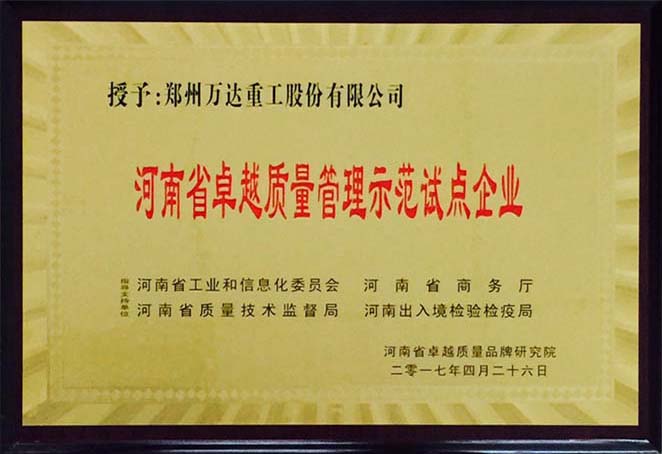 2017/05/03 466 熱烈祝賀鄭州萬達重工股份有限公司榮獲由河南省工業(yè)和信息化委員會、河南省商務(wù)廳、河南省質(zhì)量技術(shù)監(jiān)督局及河南出入境檢驗檢疫局等單位共同指導(dǎo),河南省卓越質(zhì)量品牌研究院組織評選認定的河南省卓越質(zhì)量管理示范試點企業(yè)榮譽稱號。