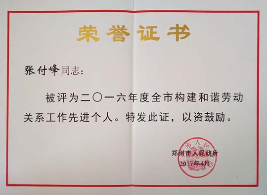 2017/06/28 678 熱烈祝 賀鄭州萬達重工股份有限公司總經(jīng)理張付峰同志被鄭州市人民政府評為2016年度鄭州市構(gòu)建和諧勞動關(guān)系工作先進個人。